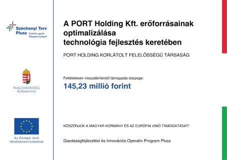 A PORT Holding Korlátolt Felelősségű Társaság 100.500.000 Ft támogatást nyert a „Mikro-, kis- és középvállalkozások termelési kapacitásainak bővítése” c. pályázati kiíráson. A megítélt támogatás a projekt összköltségének 50%-a volt.